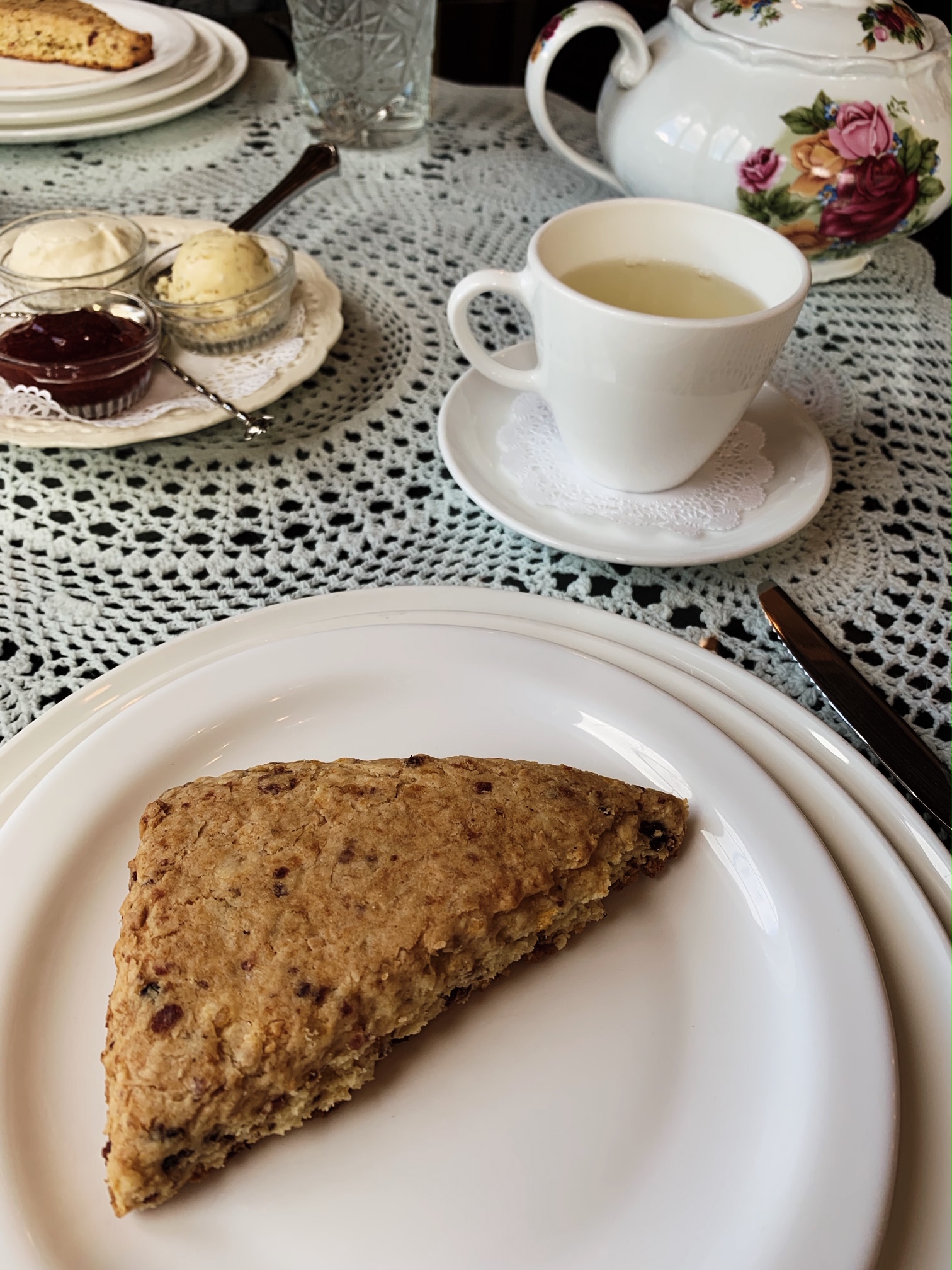 We picked out our teas: Pink Lemonade and Mango Tango. I know, I know. Pink Lemonade hot tea? Don’t knock it til you try it my friends. It was delicious. We both agreed that the Mango Tango was our favorite though. It was so aromatic . Armed with our first pot of tea, scones were brought. They have a few different tea time options to choose from if the four course High Tea isn’t what you’re into.