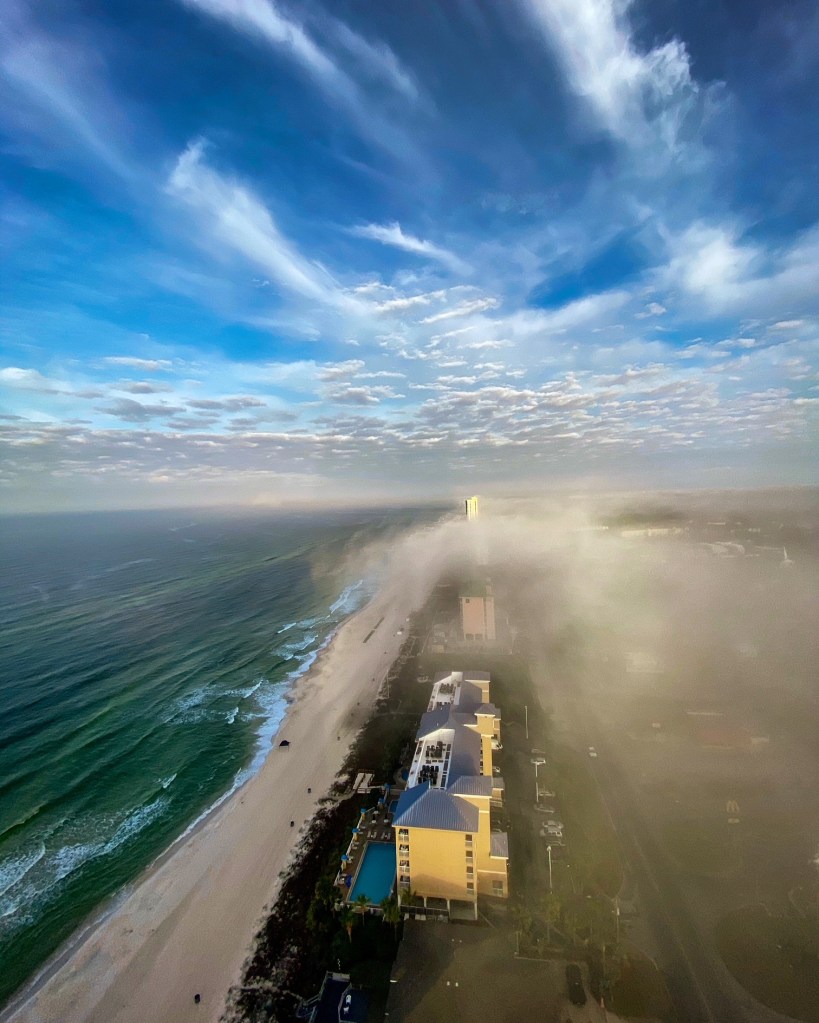 Our first night we stayed at the Hampton Inn and Suites right on the beach. While the hotel was nice, the general manager was unmasked and rude. The hotel was clean and they offered a free breakfast, but I’ll stick to my Airbnbs. We ended up with an incredible condo over at the Tidewater on Front Beach Road. I typically only book with Superhosts and never new Airbnbs but I decided to chance it with this one since it was professionally managed. Y’all I don’t think I’ve ever stayed in a cleaner Airbnb and y’all know we’ve stayed in some nice places. The views were incredible, the condo was beautiful, I’d definitely stay there again. There was one morning we woke up to thick fog, but we were so high up that we felt like we were waking up in the clouds. I loved it.