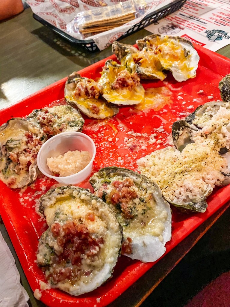 The wait was an hour, so we hung out outside on the patio and listened to some god awful karaoke, but hey they have more courage than I do! Once inside, look up. The ceiling is COVERED in one dollar bills. I love places like this, there’s always cool stories and even cooler people. But on to the food, I ordered baked oysters three different ways: Rockefeller, Bacon and Cheddar, and Garlic and Parm with Crab. Y’all they were soooo good.