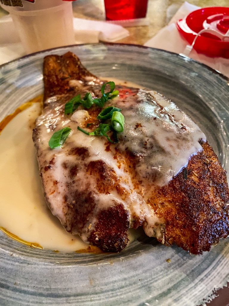 I ended up ordering the Redfish Antigua, which was amazing. The fish was cooked to perfection, the sauce was delicious, and the presentation was impressive. It was a massive piece of fish and I did not finish it, but I would definitely go back to Sharky’s in a slower season. It was really obvious that the servers were overwhelmed with the amount of people.