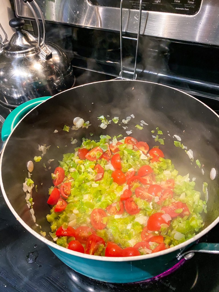 Starting off with your ground beef, toss in some paprika, italian seasonings, salt, and pepper as you cook it up on medium high heat in a large soup pot. OH YEAH IT’S A ONE POT RECIPE. It doesn’t need to be heavily seasoned but it should be seasoned. While it’s cooking, chop up your onion, garlic, cherry tomatoes (I did quarters), and bell pepper. Feel free to cheat and use frozen pre chopped veggies like I did with the bell pepper. Get your beef cooked completely and drain. We’ll come back to it later.