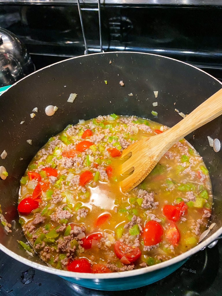 As soon as your husband starts to question what you’re about to feed him, add in the ground beef and cooking broth. Stir well to mix in the beef. Lower the heat to medium low and let it simmer.